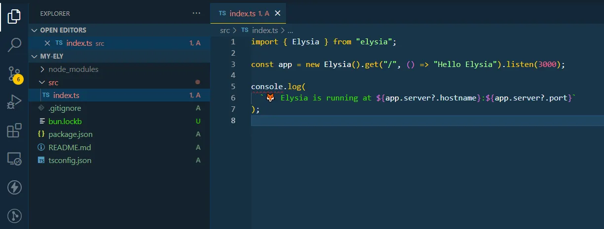 Elysia.js syntax should be familiar to anyone who used Express.js before. Upon importing Elysia, you create an instance of it and assign it to a new variable (app).