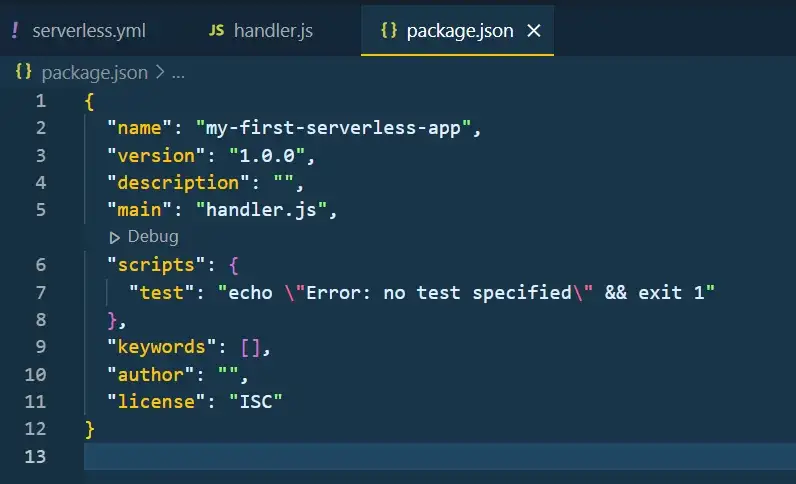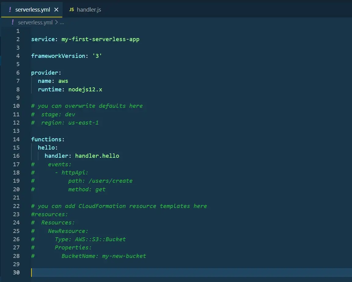 If we go into the directory we’ve just generated, we’ll find two files that are of interest to us, handler.js and serverless.yml.