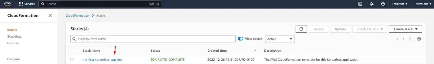If we search for CloudFormation in the AWS Console and go there, we’ll see our function. (as long as we’re in the correct region).