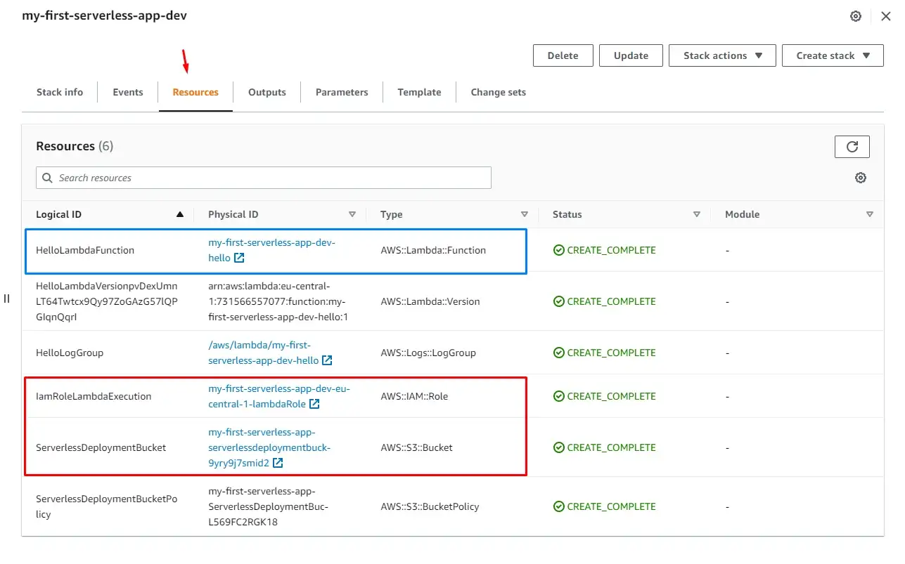 Upon deployment, the serverless.yml file generates a CloudFormation stack and links all resources that our function uses.
