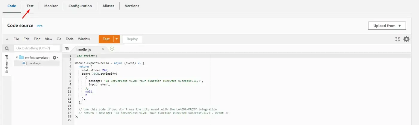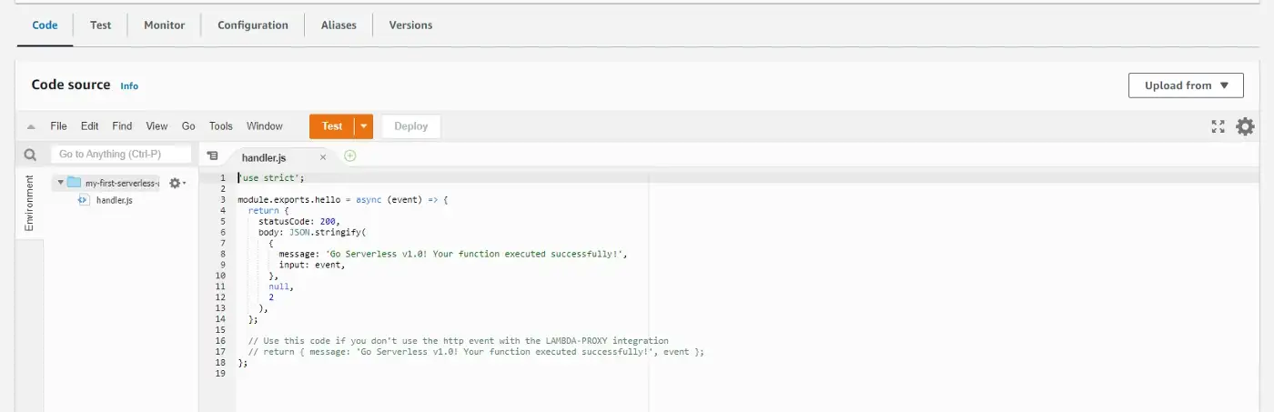 'use strict'; module.exports.hello = async (event) => { return { statusCode: 200, body: JSON.stringify( { message:'Go Serverless v1.0! Your function executed successfully!', input:event, }, null, 2 ), }; // Use this code if you don't use the http event with the LAMBDA-PROXY integration // return { message: 'Go Serverless v1.0! Your function executed successfully!', event }; ;