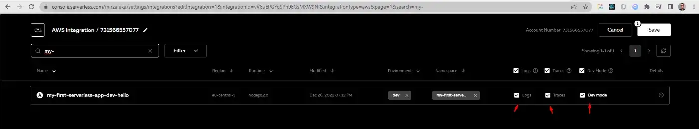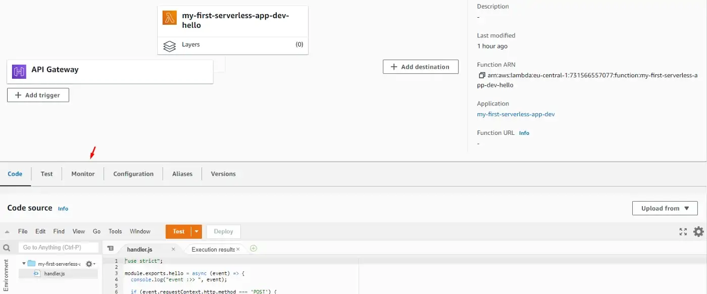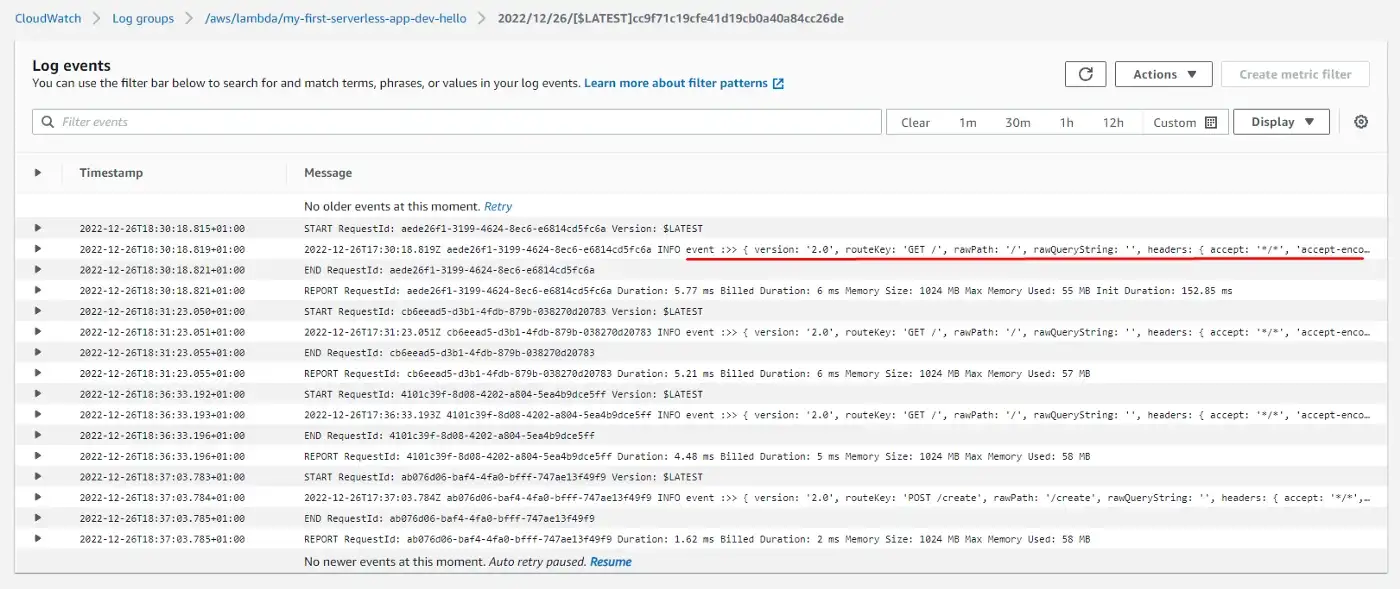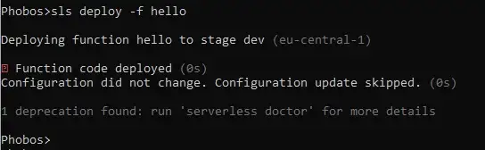 This time we haven’t changed our infrastructure at all, thus when deploying we can use a shorthand to just deploy the function code.sls deploy -f hello // -f is shorthand for function
