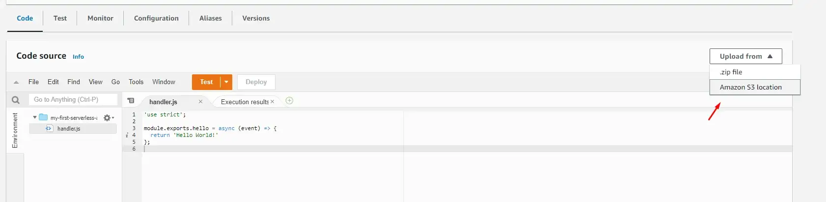 Alternatively, we can upload our code to the S3 bucket and link Lambda to S3 — which is what the Serverless Framework is already doing for us behind the scenes.