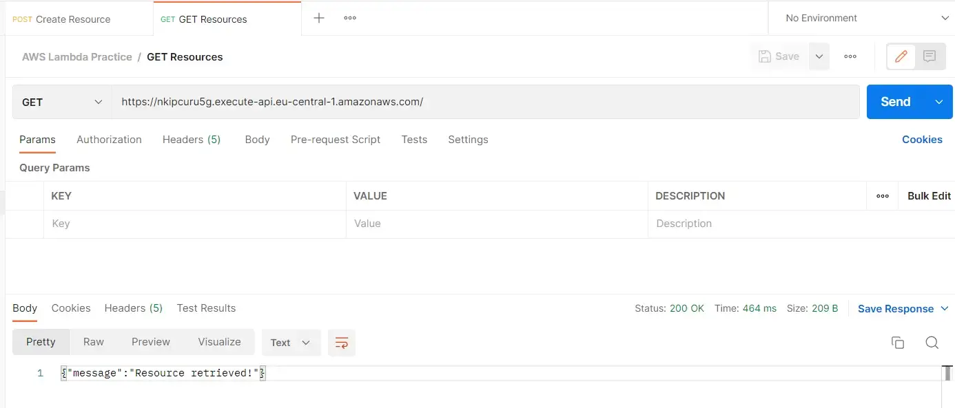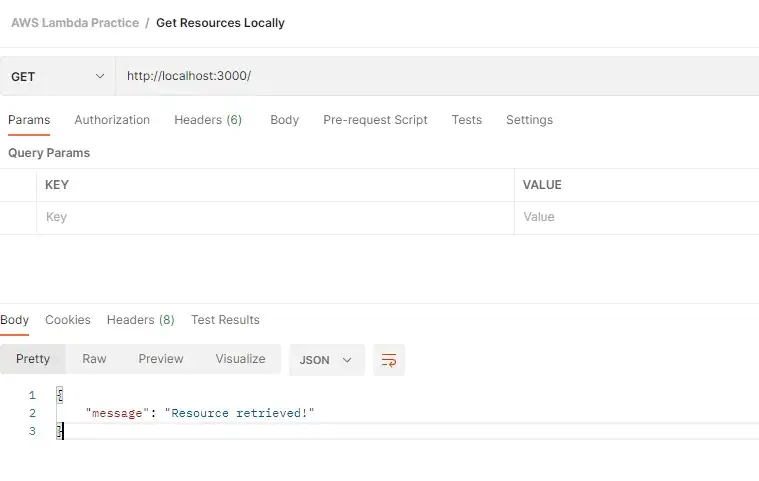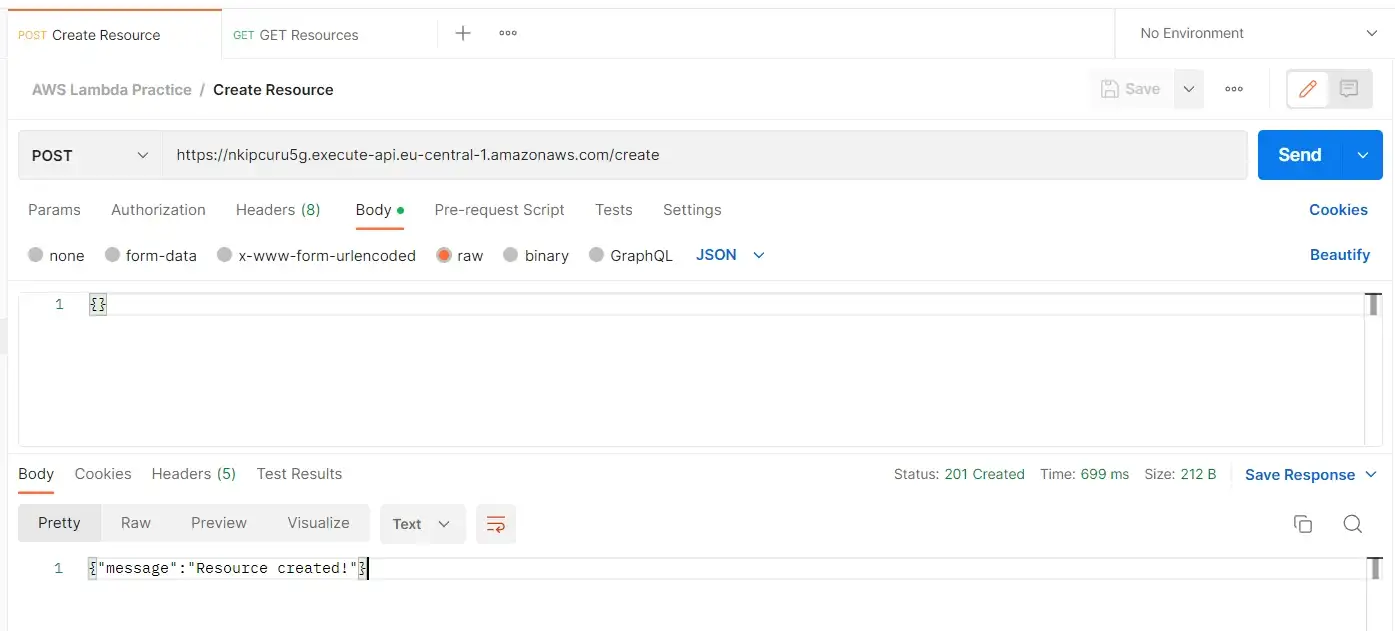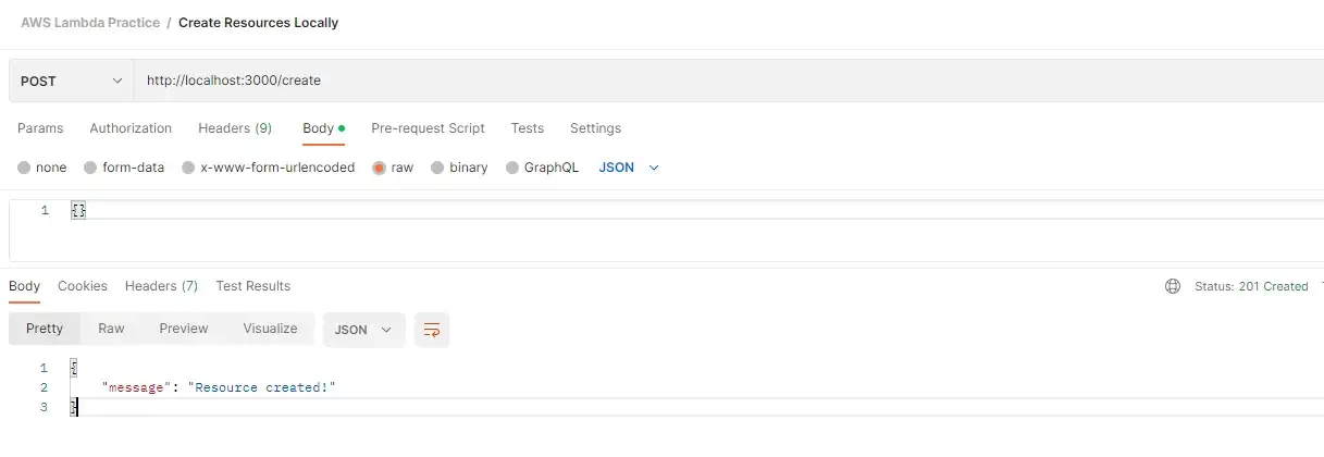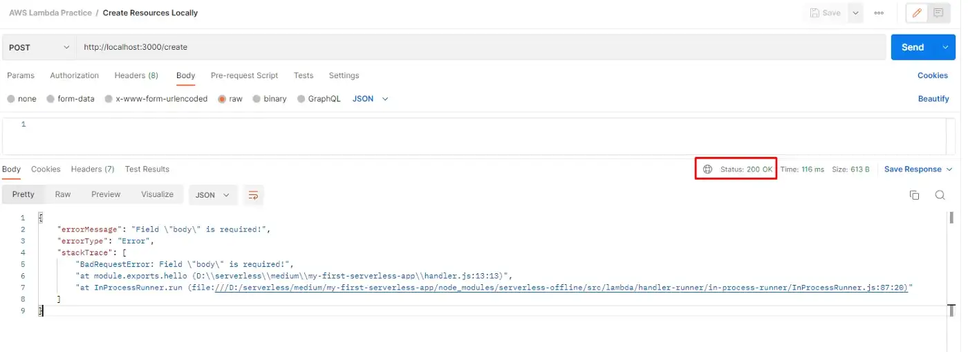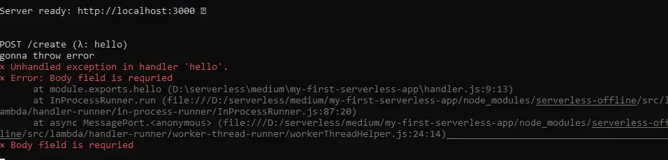 module.exports.hello = async (event) => { if (event.requestContext.http.method === 'POST') { if (!event.body) { console.log('gonna throw error') throw new Error('Body field is requried') } return { statusCode: 201, body: JSON.stringify({ message:"Resource created!", }), }; } ... }
