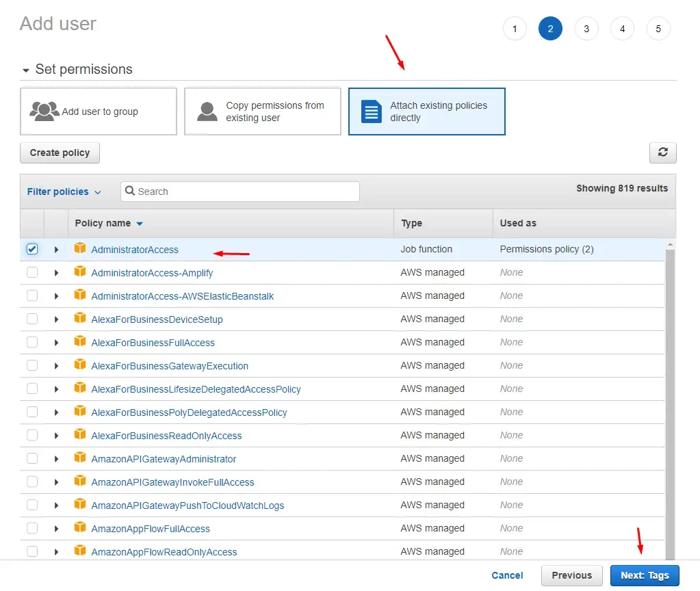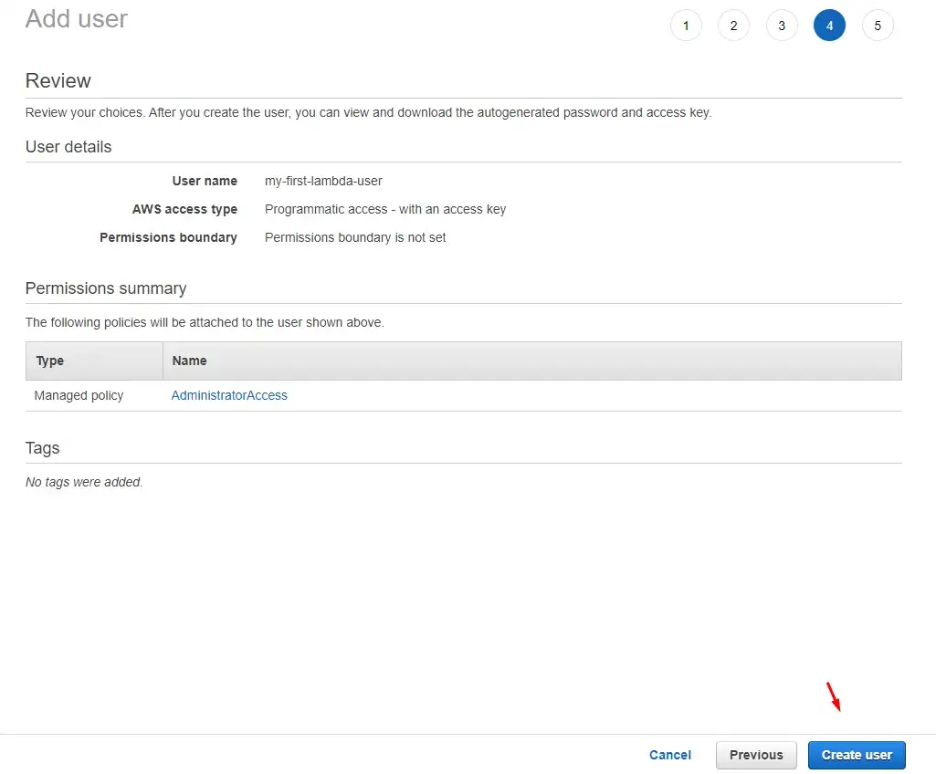 Step 5: We get to the Tags page that we can just skip. Then we land on the final page and just click Create user button.