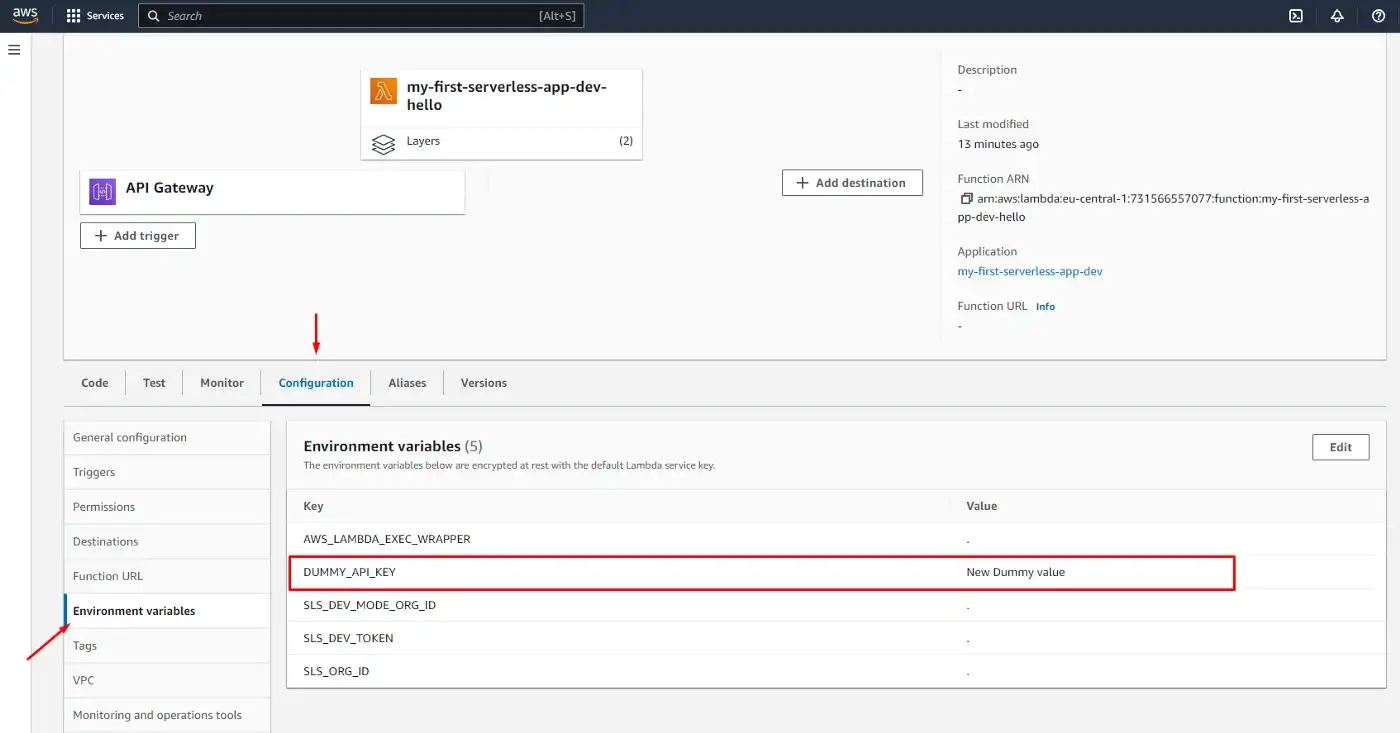service: my-first-serverless-app frameworkVersion: '3' provider: name: aws runtime: nodejs16.x httpApi: cors: true environment: DUMMY_API_KEY: 'Dummy value' stage: dev region: eu-central-1 functions: hello: handler: handler.hello environment: DUMMY_API_KEY: 'New Dummy value' events: - httpApi: path: / method: get - httpApi: path: /create method: post plugins: - serverless-offline - serverless-plugin-typescript
