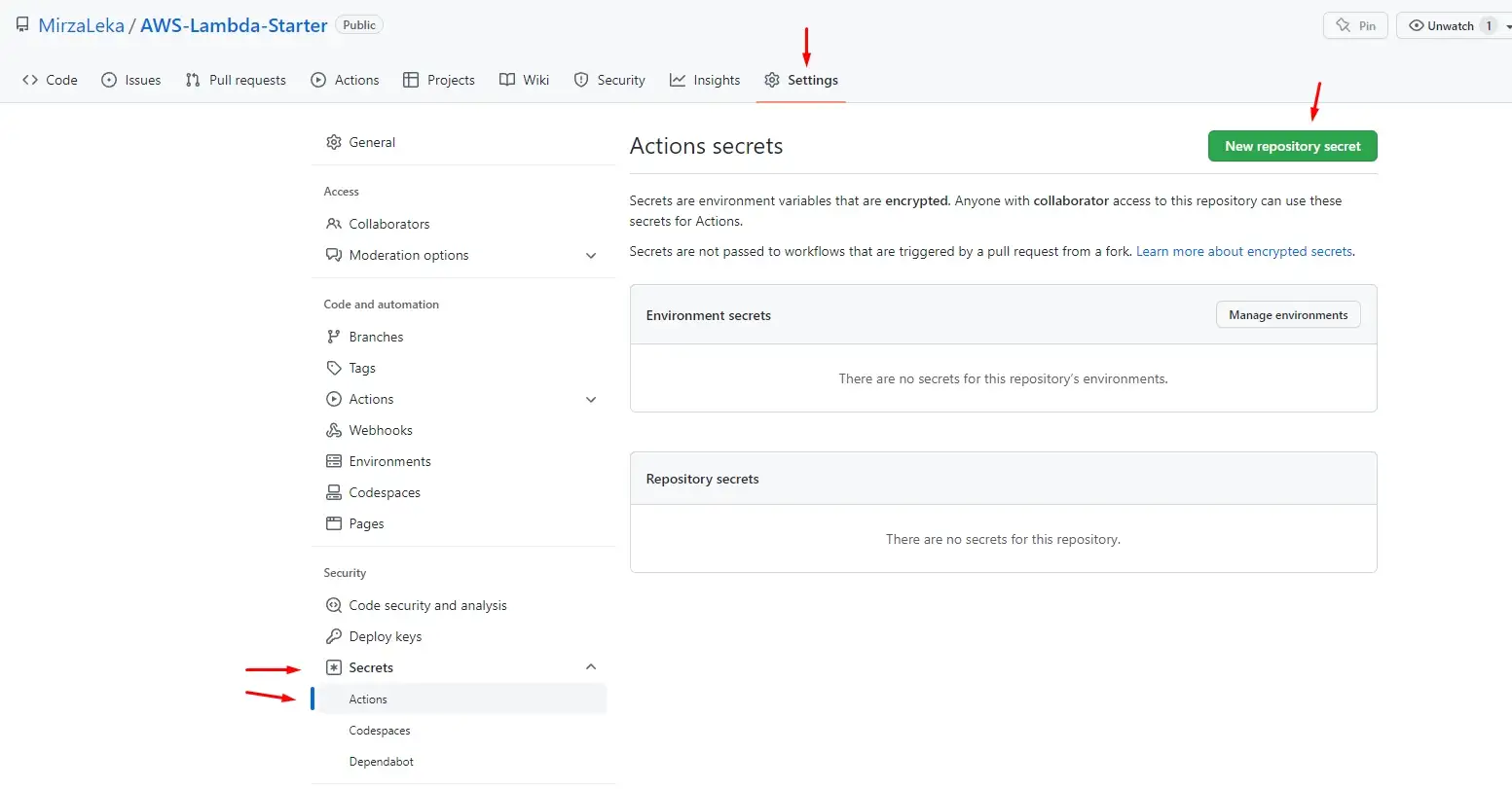 It should look like this (with our AWS Serverless GitHub secrets set)