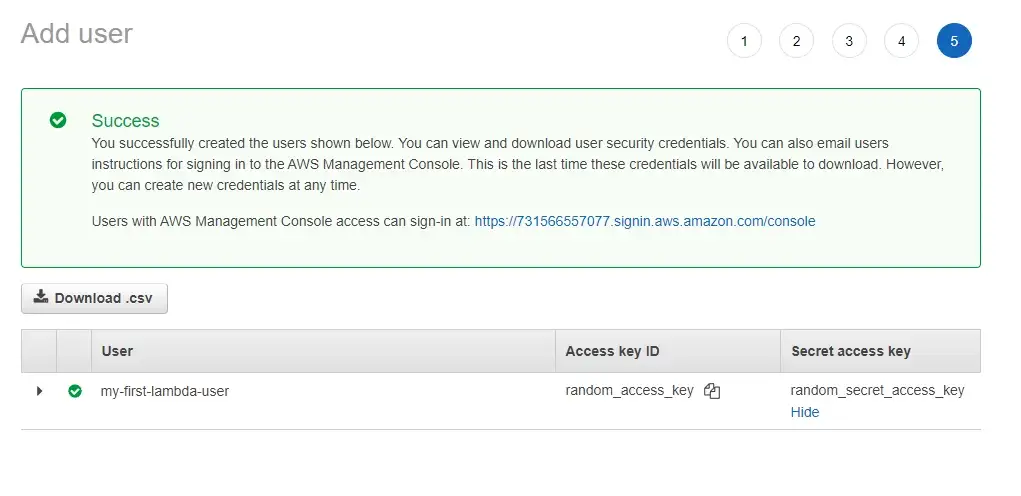 Step 6: On the final screen, we get our access key and secret key that we’ll use to authenticate with Serverless Framework. These are super important.