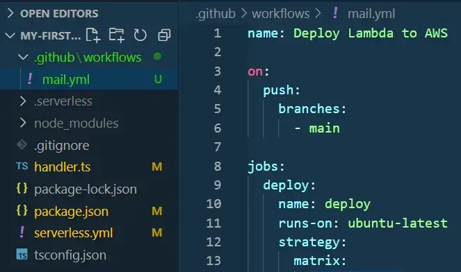 We can find an example of the main.yml file on the Serverless GitHub Actions page.