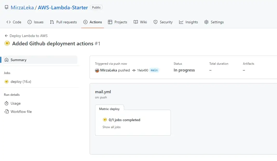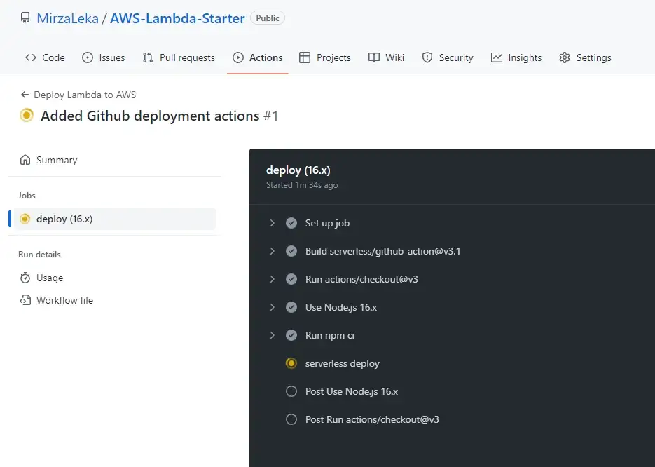 Upon pushing we should see a new job running under the Actions tab in the GitHub repository.