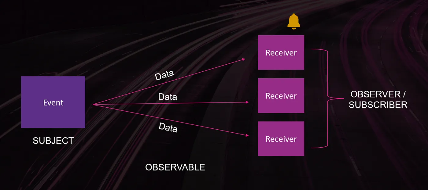 The data that is passed from Producer (Subject) to the Consumer/Receiver (Observer) is wrapped into an Observable. The Observable represents a sequence of events that occur in a never-ending interval.