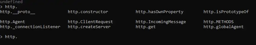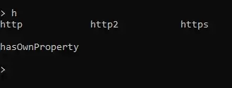 Also, you can just type one letter or part of the word and hit the Tab twice and Node.js will autocomplete all modules/objects/methods starting with that letter, e.g. type h and hit the Tab key twice.