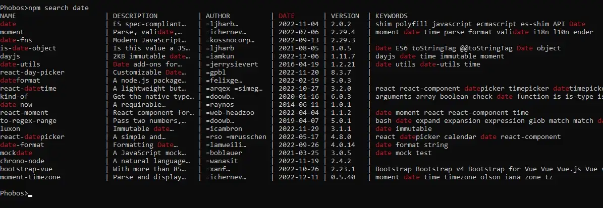 Another example of a search using a word relevant to the package. For example, there are a bunch of libraries on NPM that work with date formats. If you enter npm search date it will return libraries such as Moment, Date-Fns, Day.js, etc.