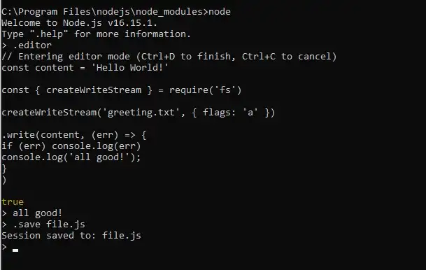 Alternatively, you can type .editor which opens an editor mode, the likes of Vim. You create a new line with the Enter key. Once you finish writing, you can evaluate your code by pressing CTRL/CMD+D.