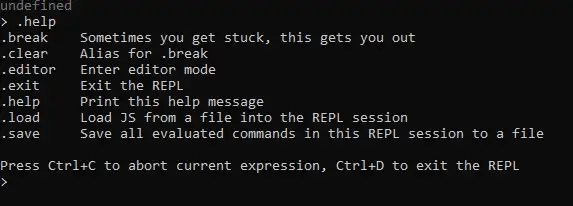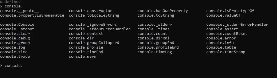 Another cool thing about REPL is that it gives you a list of commands available to you. Type the command and press period. After that hit the Tab key twice. This will print all properties and methods on that object.